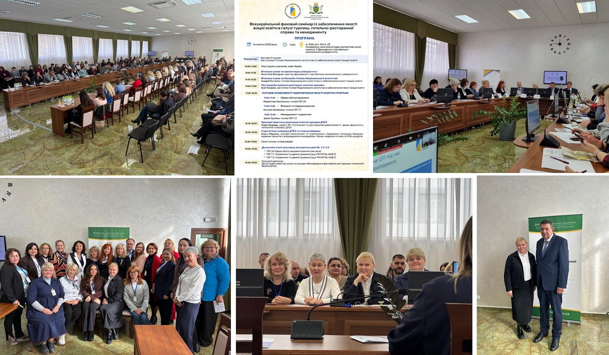 Семінар, організований Національним агентством із забезпечення якості вищої освіти, проходив на базі Державного торговельно-економічного університету і мав на меті обговорення галузевих особливостей забезпечення якості освітніх програм за спеціальностями “Туризм і рекреація”, “Готельно-ресторанна справа та кейтеринг” та “Управління та адміністрування”. Голова Нацагентства Адрій Бутенко доповів про результати акредитаційних процедур, його заступник Іван Назаров ознайомив з процедурою постакредитаційного моніторингу освітніх програм, голови Галузевих експертних рад розповіли про позитивні практики і недоліки аналізу ключових критеріїв, за якими здійснюється оцінка якості освітніх програм.