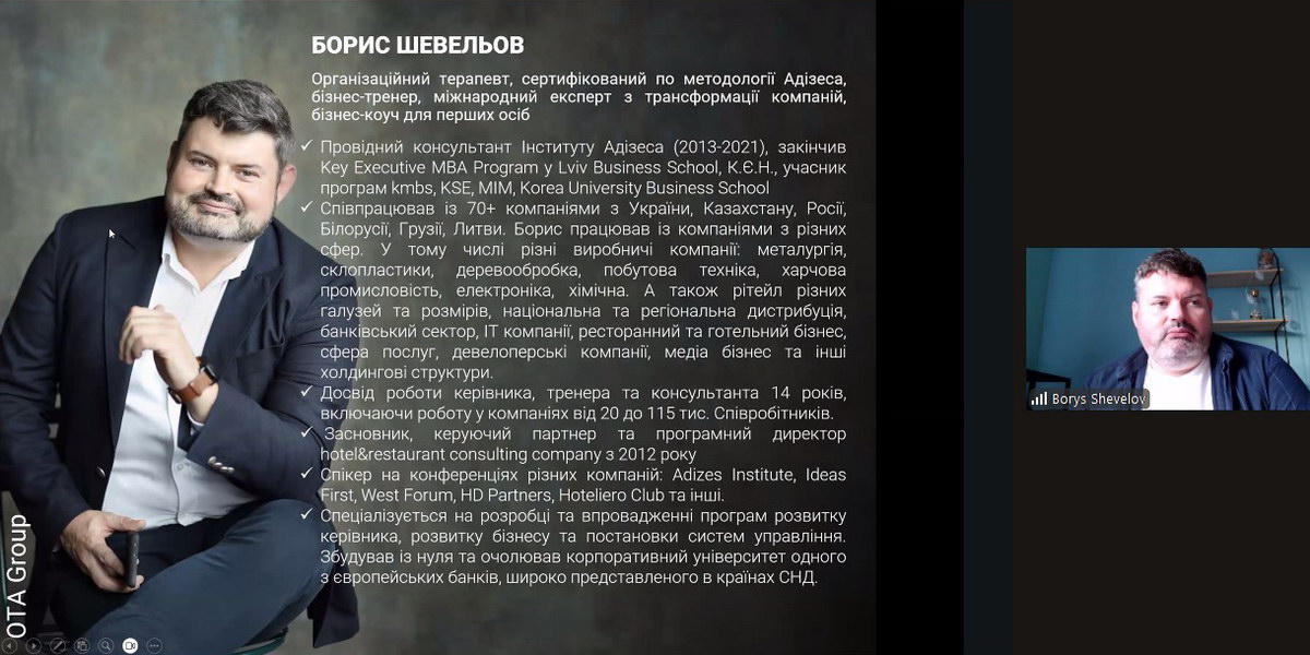 Організатором заходу виступила міжнародна консалтингова компанія OTA Group, котра надає послуги середньому та великому бізнесу в Україні та за кордоном. Спікером виступив Professional Director OTA Group, організаційний терапевт, бізнес-тренер, міжнародний експерт з трансформації компаній Борис Шевельов.
