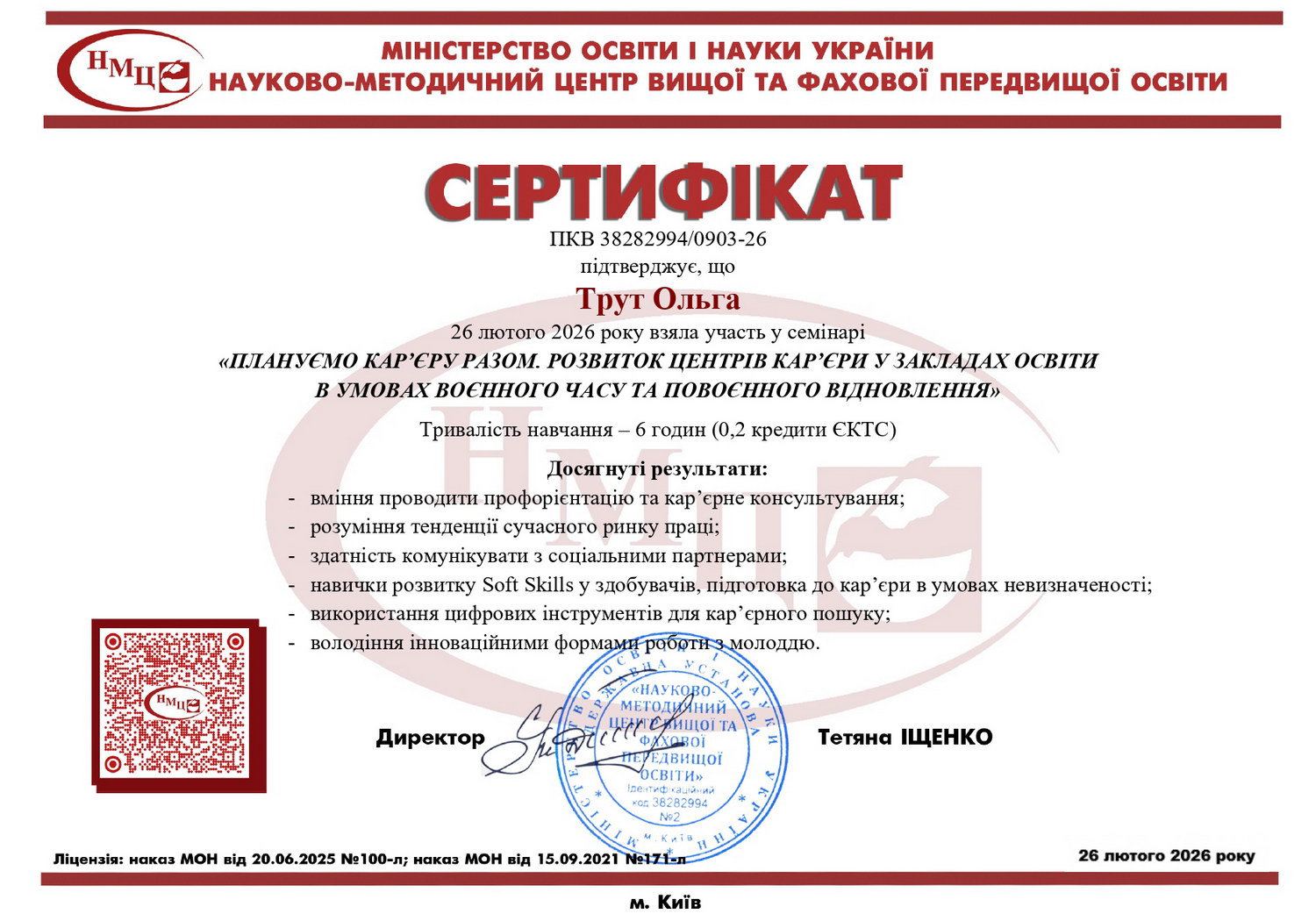 26 лютого 2026 року завідувачка кафедри менеджменту, гарант першого (бакалаврського рівня) вищої освіти ОПП «Менеджмент», проф. Ольга Трут та гарант другого (магістерського) рівня вищої освіти ОПП «Менеджмент», проф. Ірена Свидрук взяли участь в роботі семінару «Розвиток центрів кар’єри у закладах освіти в умовах воєнного часу та повоєнного відновлення».